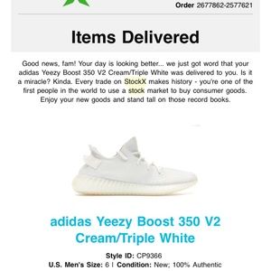 Triple white yeezys / worn a couple times. Only has that small mark on the insoles from being worn. Which is pictured above. Size 6 in men’s which equals a 7 in Woman’s. I’m a size 7 and they fit perfect! . Will sell on 🅿️🅿️ for $260 or make me an offer. Proof of purchase ✔️
