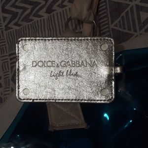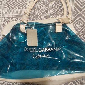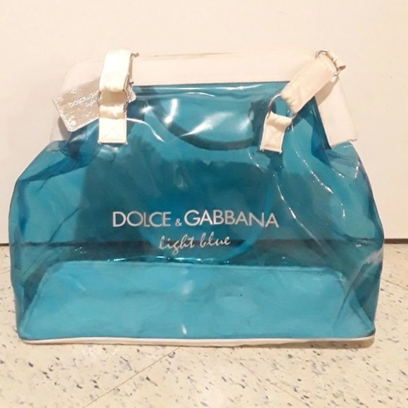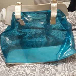 Name brand hand bag that is a light blue see through. This is a versatile bag as it can be used as a hand bag, beach bag, or traveling bag. This bad has barely ever been used.. just put in the back of the closet for a while. Will negotiate on price bc looking to get rid of it!