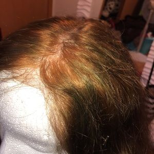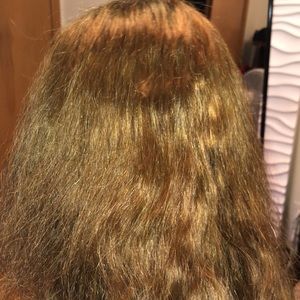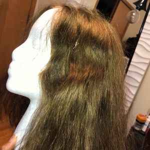 Brazilian HUMAN hair that was bleached and dyed. (Hair needs to be re-dyed) Hair is super soft and still in good condition. I like longer wigs so I barely wore this one. It has transparent lace and combs inside the cap. Wig constructed beautifully.