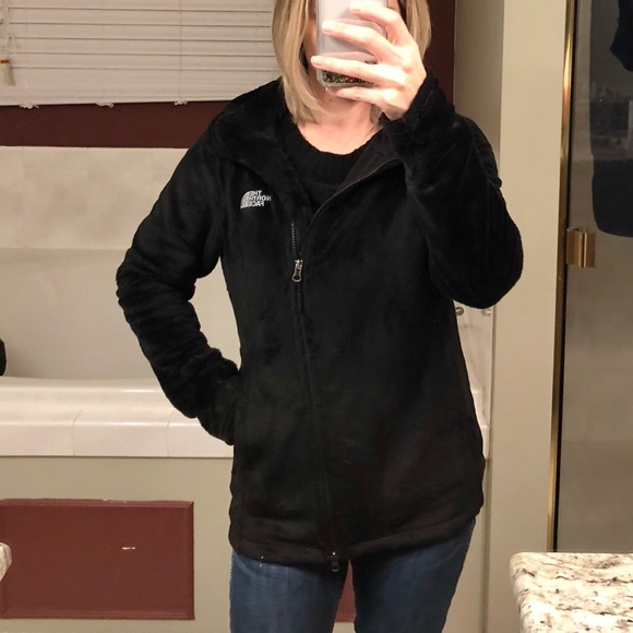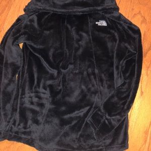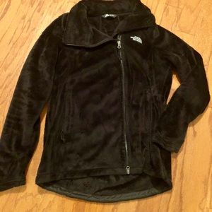 The North Face soft and warm coat. Black. Size medium. Off center zip. Thumb holes. Side zip pockets.