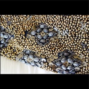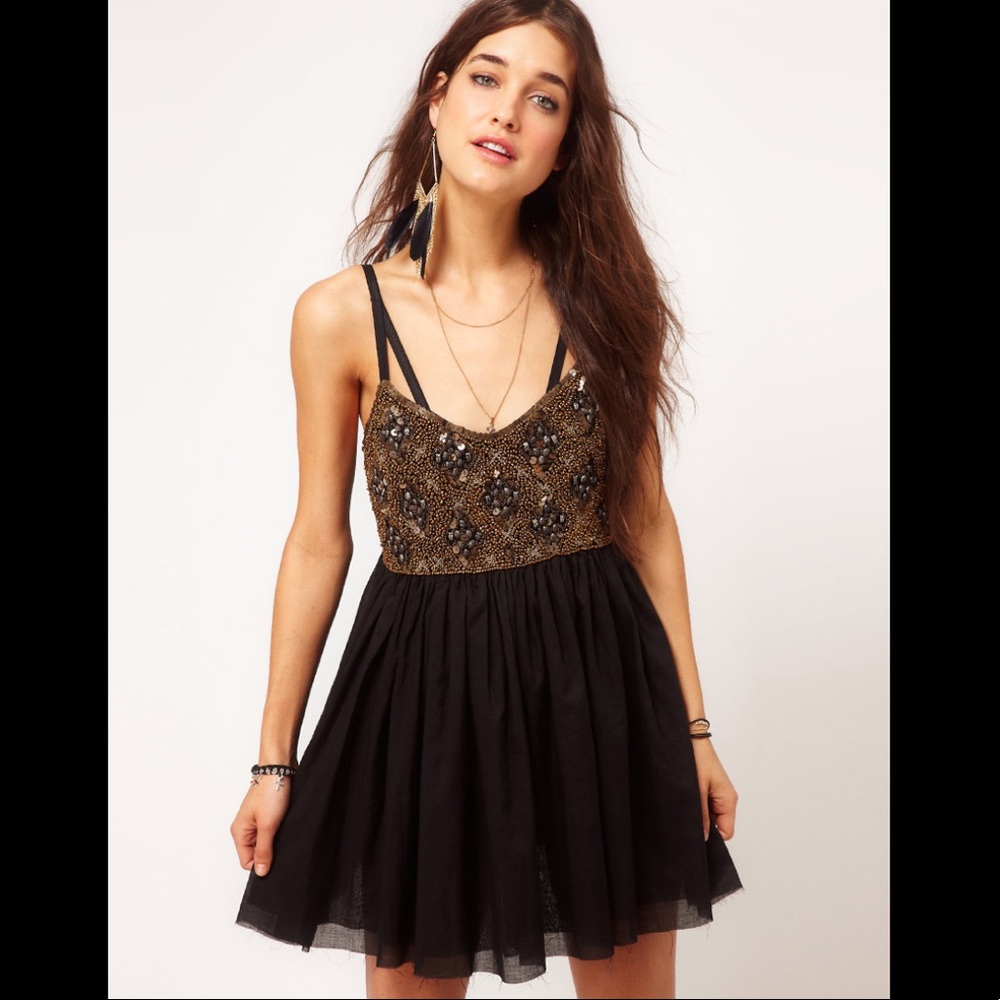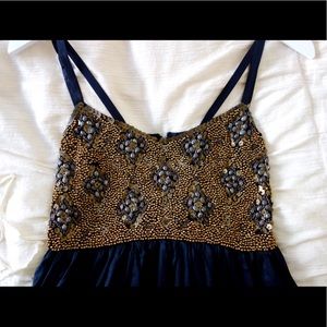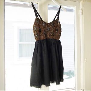 Cute and glamorous babydoll dress with gorgeous gold beading on bodice area. Raw hem on skirt gives it a rocker vibe while the skirt layers and beadwork keep it feeling upscale. Zip closure in back. Worn once!!