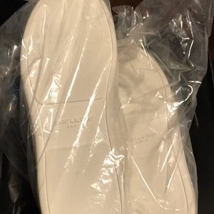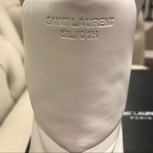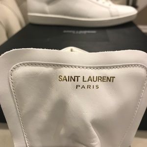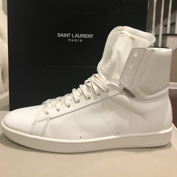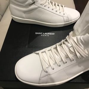 You are viewing a pair of brand new men’s Saint Laurent sneakers. They are 100% authentic all white leather high top sneakers. They have a high tongue with the Saint Laurent logo in gold. They are a size 45 European equivalent to a size 11 US. They come with a dust bag and original box.