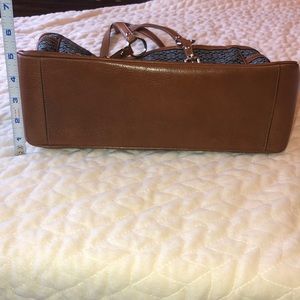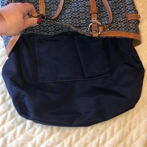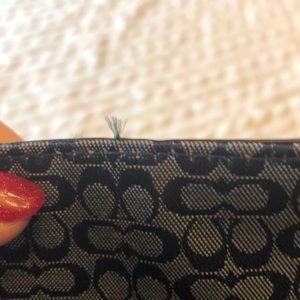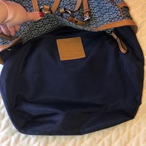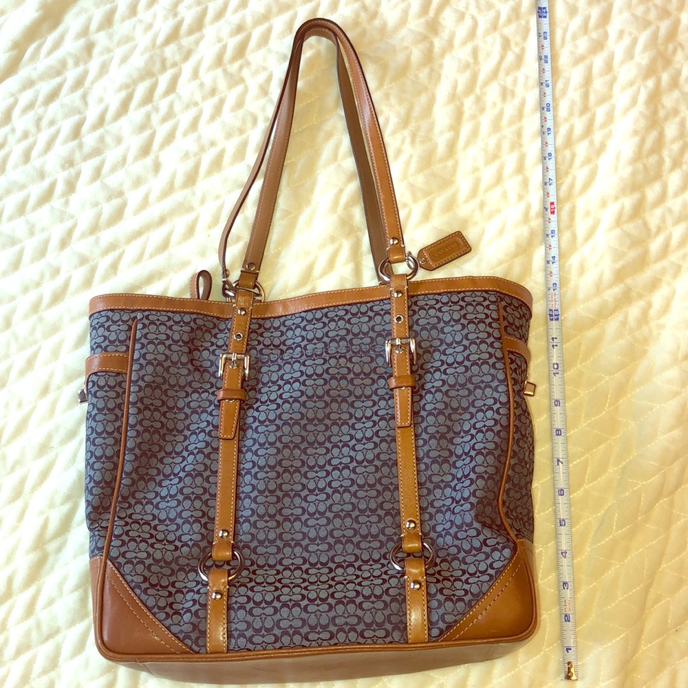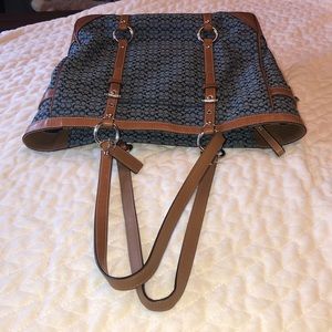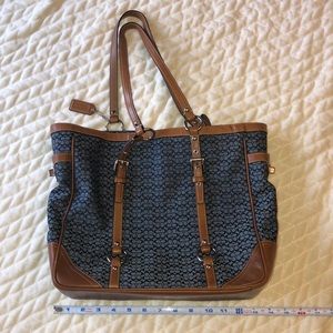 Classic and practical Coach signature fabric logo tote. Blue logo canvas and soft leather trim, double straps, and bottom. Excellent condition, no wear on leather, exterior and interior. Extremely small thread on top of bag (see picture, easily able to cut). Make this your new everyday professional work bag!