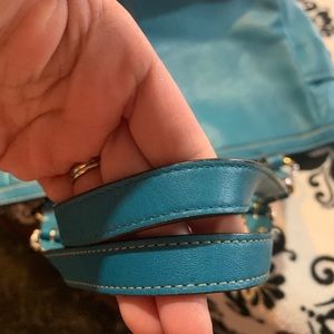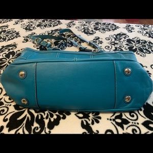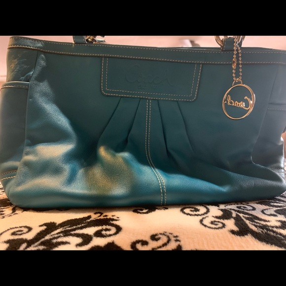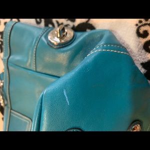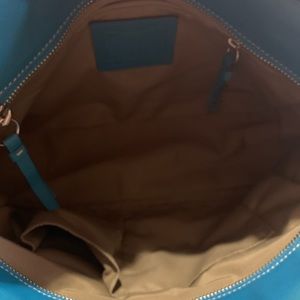 This is in good used condition. Only mark is as showed in pics. No other stains or tears. I used for about a month for work. Small but spacious. Teal in color