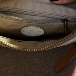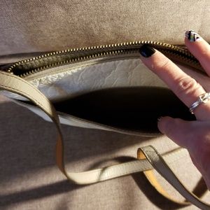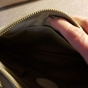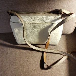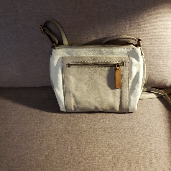 This small super cute Crossbody Bag is a cream color with dark tan accents and light tan front where a zipper pouch is. Has another pocket in the back. It is all Genuine Leather!