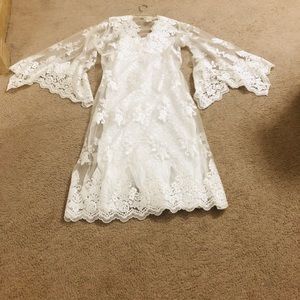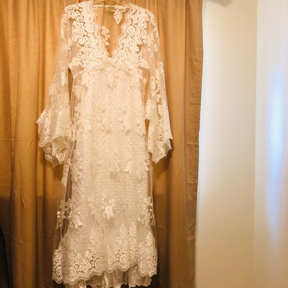 This one of a kind, beautiful mesh & floral lace dress will definitely take your breath away! Has a V neckline, a slip underneath, and a sash that ties in the back. I bought this dress for $300 and has been worn only once for my wedding reception.