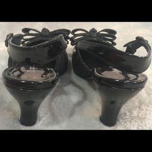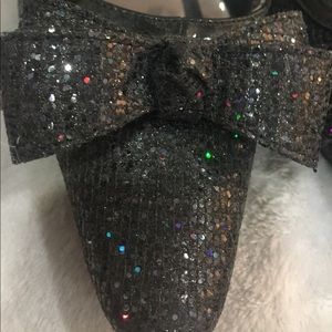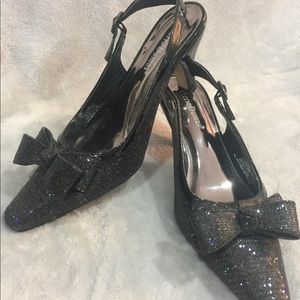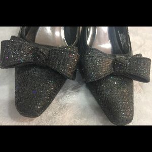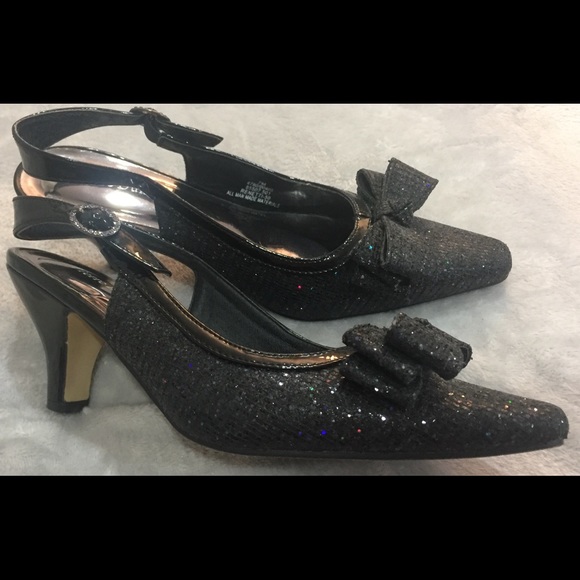 AMAZING for going out in COMFORT!! The heel is perfect height! And at the same time it dresses up and compliments any outfit. A sparkly black color with a large bow in the front. A bejeweled strap for extra flash and fun ππ