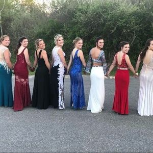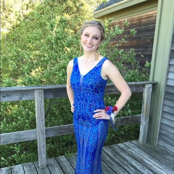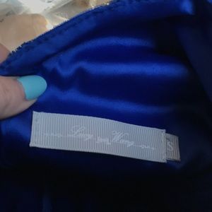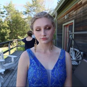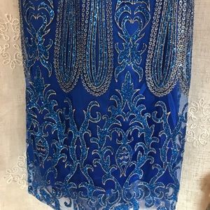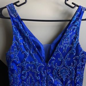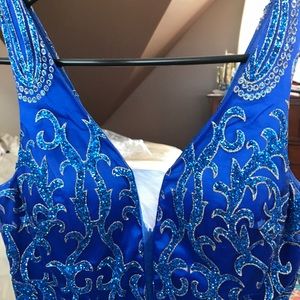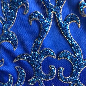 This gown is one of a kind✨ It was bought in Italy in 2017. Deep V neck in the front & back. Blue and gold sparkles covering the dress. It truly is gorgeous! Worn once and in very good condition.