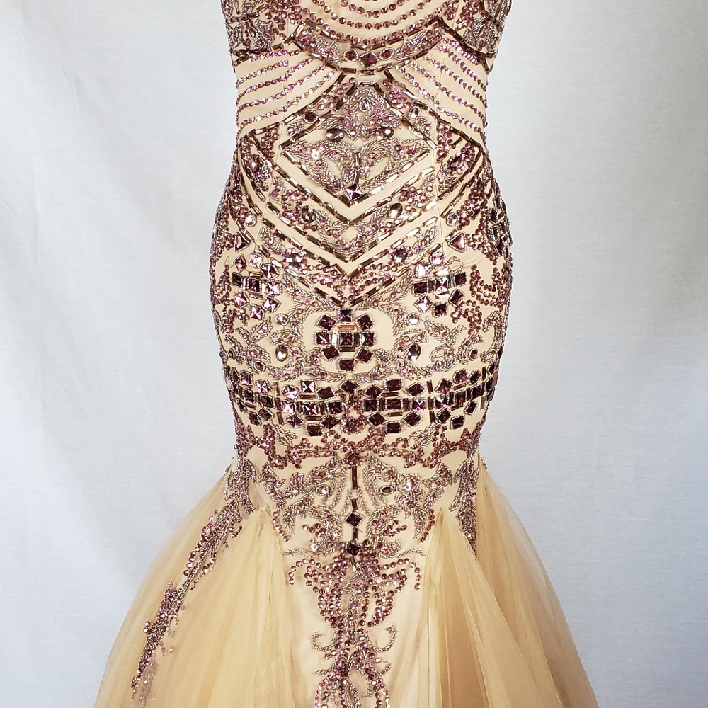 Beautiful Sherrie Hill Rare Coture nude/tan dress covered in purple Swarovski stones, Size 0-2, could fit a slim 4. shes 5'5 and wears tippy top heels dress still touches the floor. can be shortened we just never did. This dress is a showstopper!
