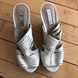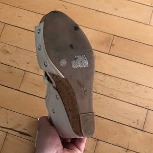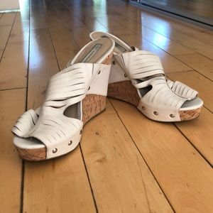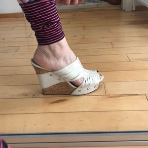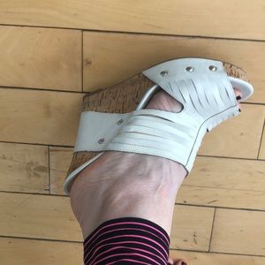 Maybe worn 3 times! These 4” H cork and white leather wedges are fantastic. Super comfortable and easy to walk in! Barely work perfect condition.