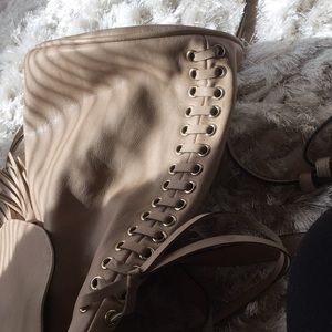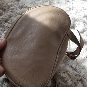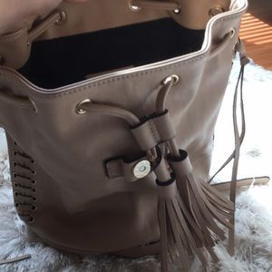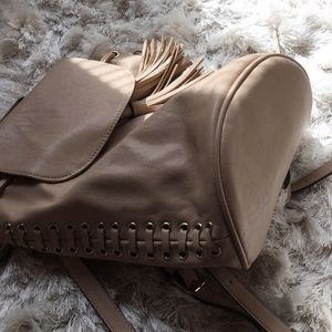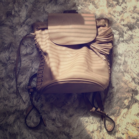 This backpack has lace on side if it on both sides and you can adjust it by pulling the two strings in front it super cute and fits a lot you also can adjust the back straps color nude💜