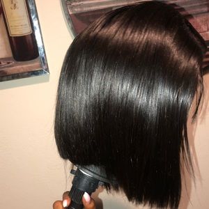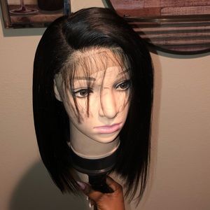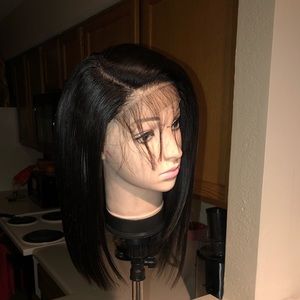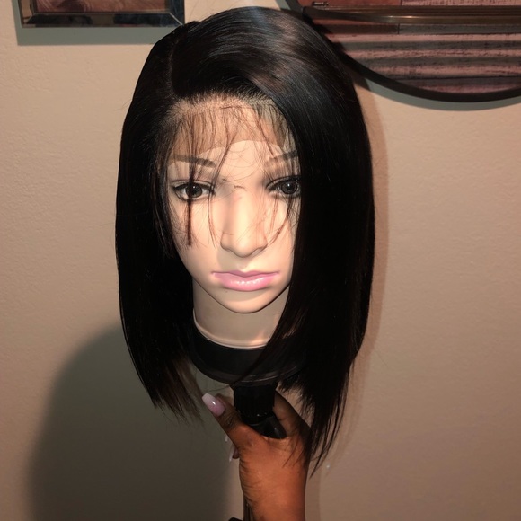 Human hair bob wig customized with 100 percent Brazilian human hair. 12 in. Closure is plucked has elastic band inside wig for security. Hair is really good!
