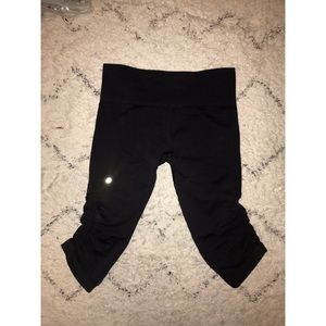 - 7/8 on me (I’m 5’10”) black, small hole on the knee, some piling, high waisted - size 6