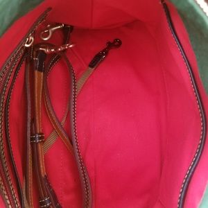 Two inside pockets. One inside zip pocket. Inside key hook. Adjustable, detachable strap. Handle drop length 4". Strap drop length 19". Lined. Feet. Zipper closure.
