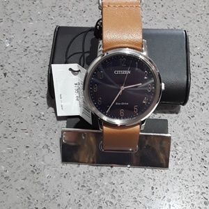 NWT nice and lightweight brown leather band with navy face. Eco drive is stunning feature runs off light not batteries. Comes with 5 year limited warranty