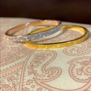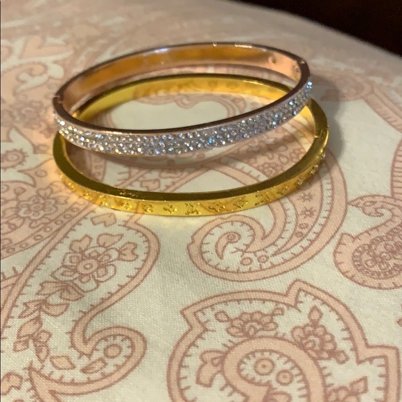 2 goldtone bracelets. 1-has crystals 2-is goldtone with LV stamped onto bracelet. These are costume jewelry. Both are oval for comfort and both have a latch on the side.