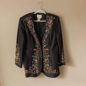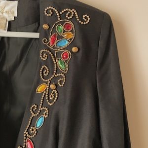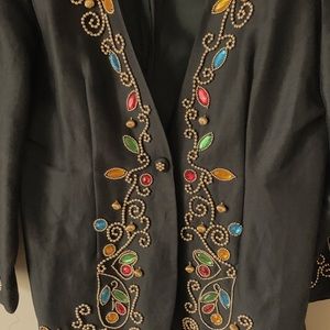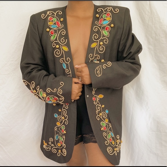 Vintage 80’s jewel blazer. Features gold beads, colorful stones thoughout with shoulder pads. Looks great on smaller frames as a blazer dress. Also, styled with high waist black biker shorts.