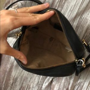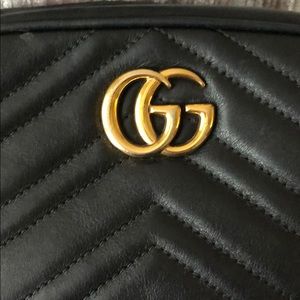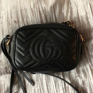 This is a Gucci GG Marmont mini chain shoulder bag. The inside has some staining. The outside in great condition. Gold has light tarnish, only visible when examining. Comes with only the bag. No receipt/dust bag.