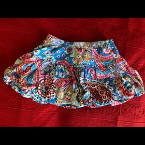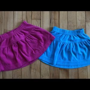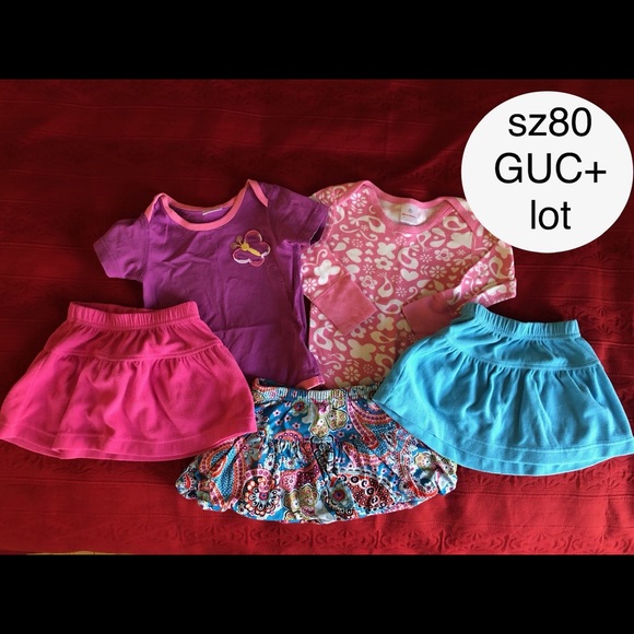 Good (look at close up for the butterfly onesie for wear under the bum; mild wash wear on the blue and pink skirts) to very good used condition (pink long sleeve and multi color skirt) lot of Hanna Andersson size 80 items.