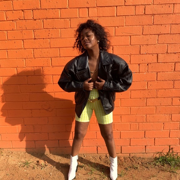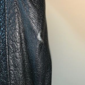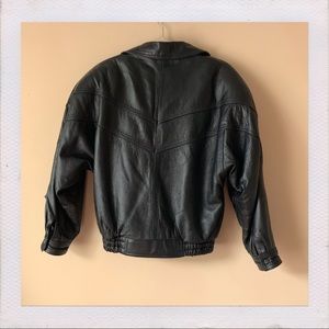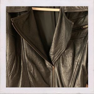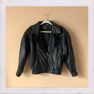Classic vintage oversized jet black biker jacket. Includes two front deep pockets with a small zipper pocket on the top left, and elastic around the bottom.