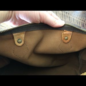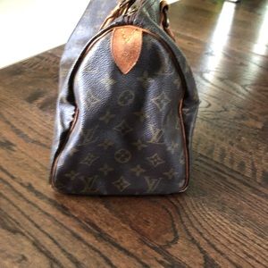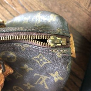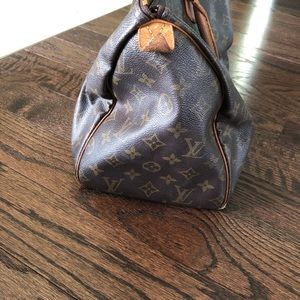 Speedy 25, darkened handles, both side tabs are still attached. Zipper works but is missing zipper pull, clean inside it does have a few pen marks but definitely no ink stains. Inside pocket all 4 corners on the bottom show wear on canvas and scuffed from being set down(see photos) used but in fair condition