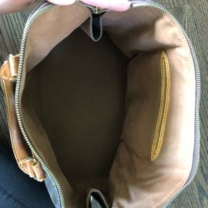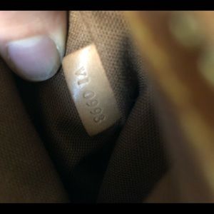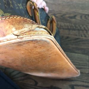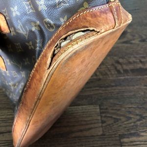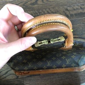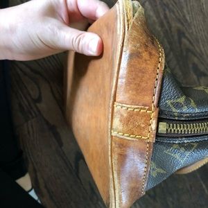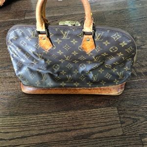 Louis Vuitton Alma, canvas looks very nice the bottom has water stains(pictured) and 3 out of the 4 corners are torn(pictured) handles are sturdy and slightly darkened, both zipper pulls work great. Clean inside with a pocket