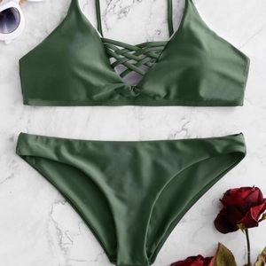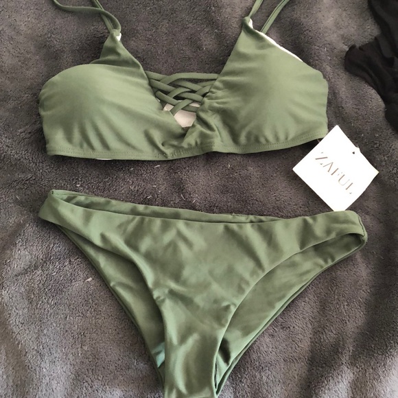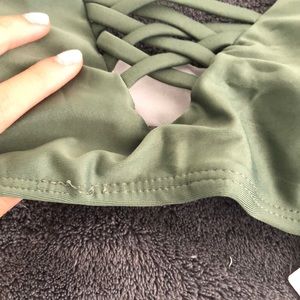 This bikini is never worn, but it has a few running threads in the front as shown in the picture. Color is hard to photograph, it’s in between the cover photo and the model photo. Regardless, it’s very cute and trendy. Selling because I think it fits my boobs kind of weird. I am a 32A with a 37” hip, 25” waist, and 105lbs. Comment any questions. Trading and reasonable offers will be considered