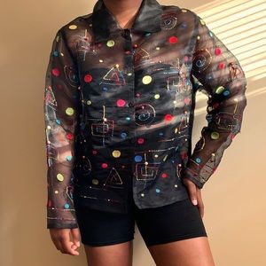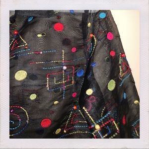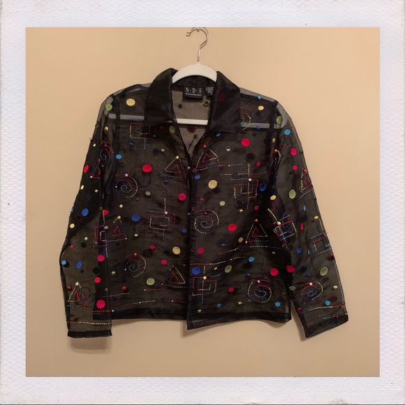 Vintage sheer pattern blouse. Features pearls and colorful geometric stitching.