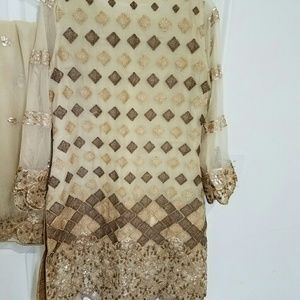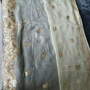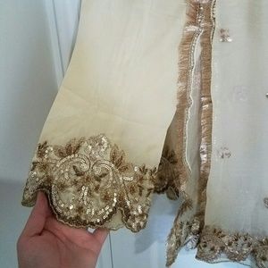 brand new full fancy sequin work with light tilla work pure shiffon material has beautiful work on pant full dupata along with fancy kiran lace.
