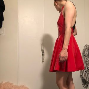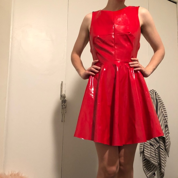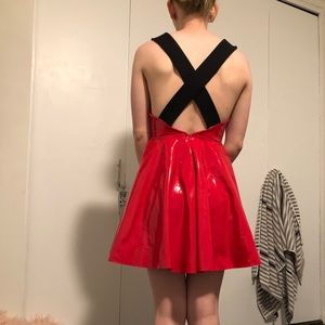Mini flame red PVC flare dress with soft lining and strappy back. NWT