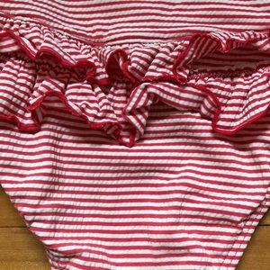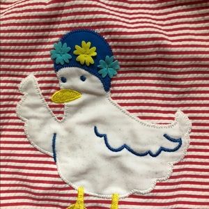 VGUC Mini Boden ruffle butt “seersucker” bathing suit with an adorable bathing duck appliqué. No visible pulls on the bum of the suit, limited sand stuck in the duck appliqué (see close up). This suit is just darling and fit us both early and late (before 18 mo and after 24 mo) with a nice roomy cut and good elastic.