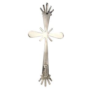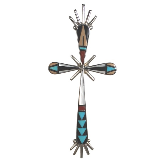 Beautiful large, Zuni cross necklace. Measures: 5" X 2.25". SIGNED by Adeline Bowannie. Inlaid with turquoise, coral, onyx, mother of pearl, sterling silver.