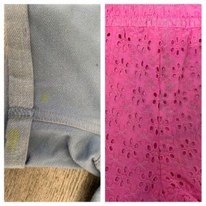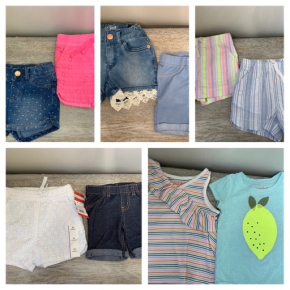 Lot of 10....8 shorts and 2 shirts. This is all you need for the summer! The options are unlimited. All from Target. The pink pair is has a butt stain from sitting or rubbing on surfaces from wear. The light blue cuff pair has very faint paint stain between legs, not noticeable while on. Otherwise this bundle is good to go.