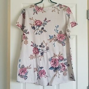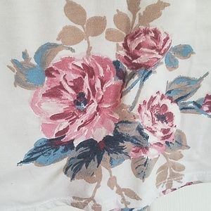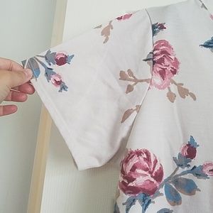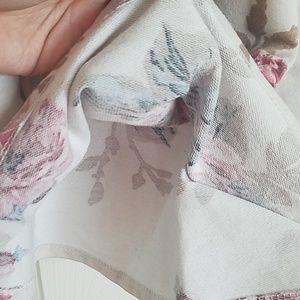 It's hard to think about now, but fall is just around the corner (can I get an amen for pumpkin spice season?!) and this tee is perfect for those days in between tank top time and full-on sweater weather. It's a thicker material, almost terry-like, with a beautiful muted greige color, topped with muted pink, navy, and tan floral. Perfect with a pair of jeans and a military style jacket! Great used condition from a pet-loving, smoke free home.