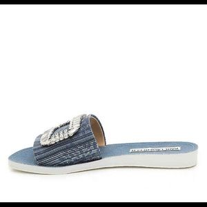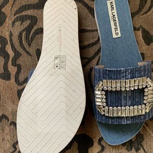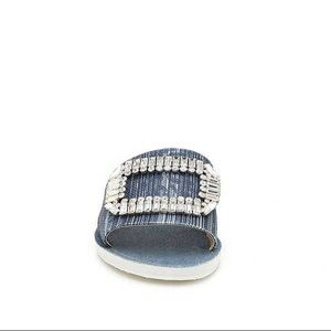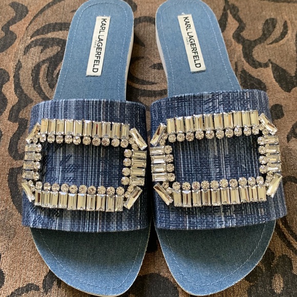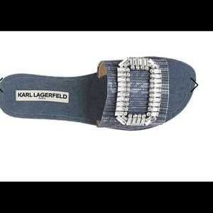 Slide into the Mirah 7 sandal from Karl Lagerfeld Paris to keep your warm weather look extra sophisticated. An oversized brooch accent is embellished with baguette rhinestones for shimmering appeal.