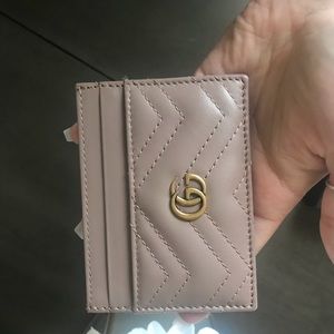 Like new Gucci GG Marmont card case holder. Used maybe twice, no signs of handling at all. Four card slots and middle pocket. Comes with box, dust bag, and a free letter of authenticity. This beautiful piece is a dusty pink matelasse chevron leather with antique gold hardware. Made in Italy. Add this small leather good to your collection today! Message me with any questions