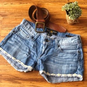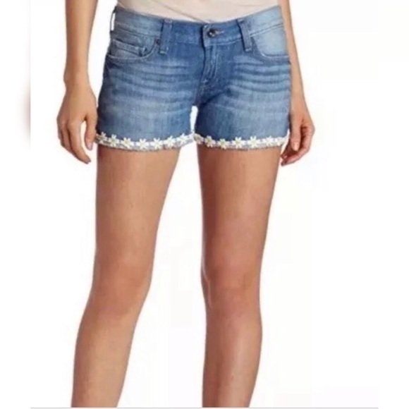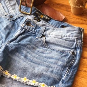Hand cut in great condition denim shorts. They have a little stretch and form well to your shape. Adorable daisy detail on bottom of shorts. Run a bit big. Normally wear a 26/2, sized down to 24/00.
