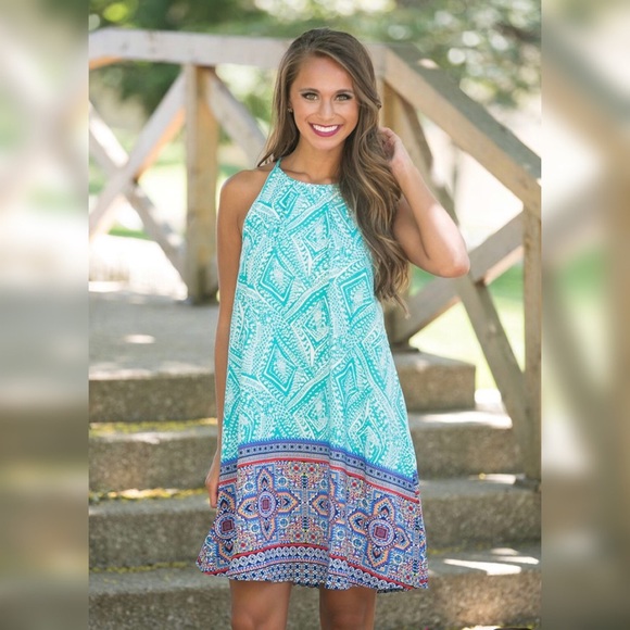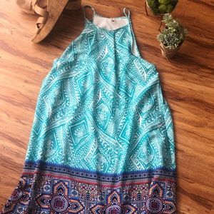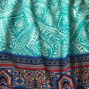 This dress has the most beautiful colors! Gorgeous detail at the bottom of dress. In mint condition. Fits true to size. Dress is lined. Colors: Shades of blue, white, orange, green.