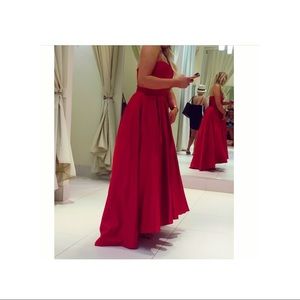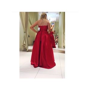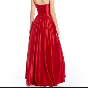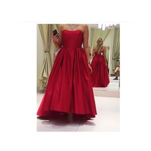 Betsy and Adam deep red strapless high low ballgown. Worn only once, in perfect condition just as new. Purchased from Lord andTaylor, no alterations have been done. Will have it dry cleaned and wrapped upon purchase.