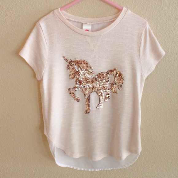 I love this girls top so much! It’s a lightweight knit top in blush with a rose gold sequin unicorn on the front. The back has a sheer white panel at the bottom that gives it a layered look... so cute! Gently used in great condition.