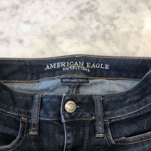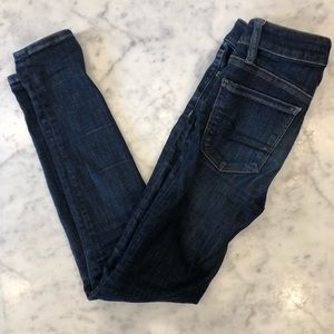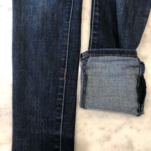Dark blue skinny jeans that are so stretchy they feel like jeggings (but still look like jeans) the stitching is in yellow and the hardware is branded. 4 fully functional pockets and embroidered back pocket. In good condition except the inside of the legs has some pulling. Not great if you have sensitive skin, but I can remove it if you request it (I have a little de-pilling machine)