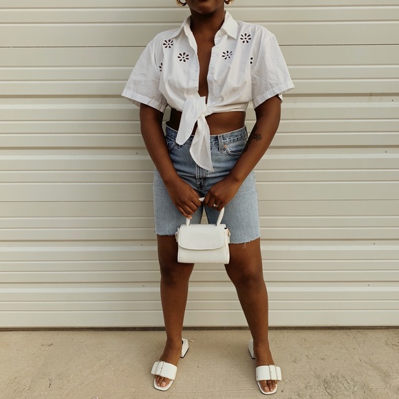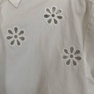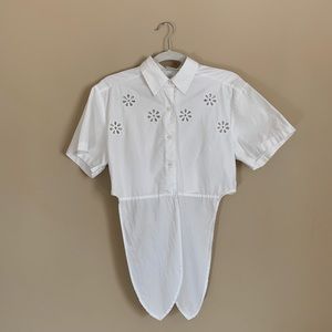 Vintage white flower embroidered button up blouse. Features cute little flower cutouts and tie (very cropped).