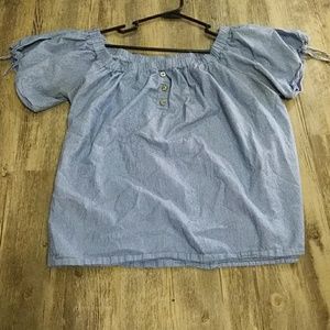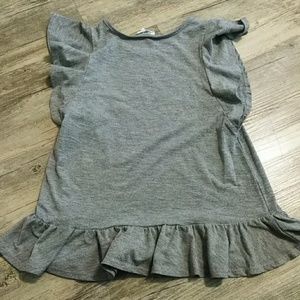 Grey Short ruffle sleeves with ruffle pattern at the bottom. With colorful saying "Dreams Will Come True".