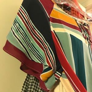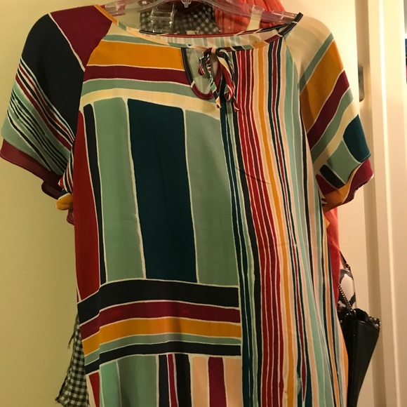 Not stains in the photos, part of the design of the shirt. As you can see they are perfectly in same line of color. All shirts at the short had this. Navy and multicolored. Soft and comfy easy wear to work shirt.
