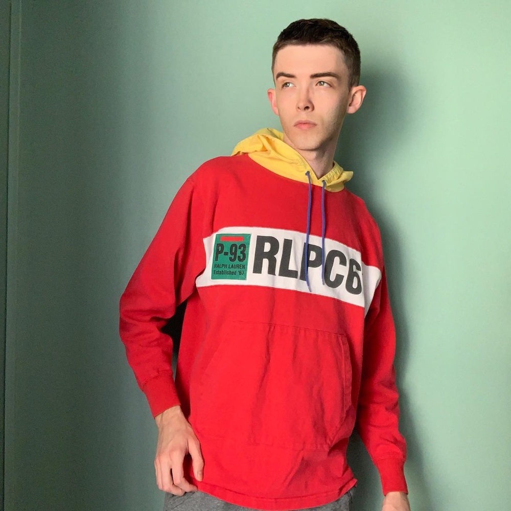 Vintage 1993 Polo Ralph Lauren RLPC67 red and yellow hoodie. On front is a big RLPC67 spell out and a green 93 patch. The hoodie has a two toned red body with a yellow hood and blue strings. A timeless treasure that happens to be a womens design but fits closer to a men`s medium. In near mint condition! Offers welcome. Length 28 inches; Width 23 inches; Sleeve 23 inches @depop #depop #vintage #ralphlauren #colorblock #hoodie