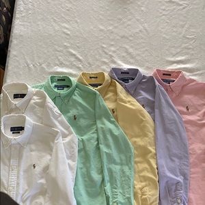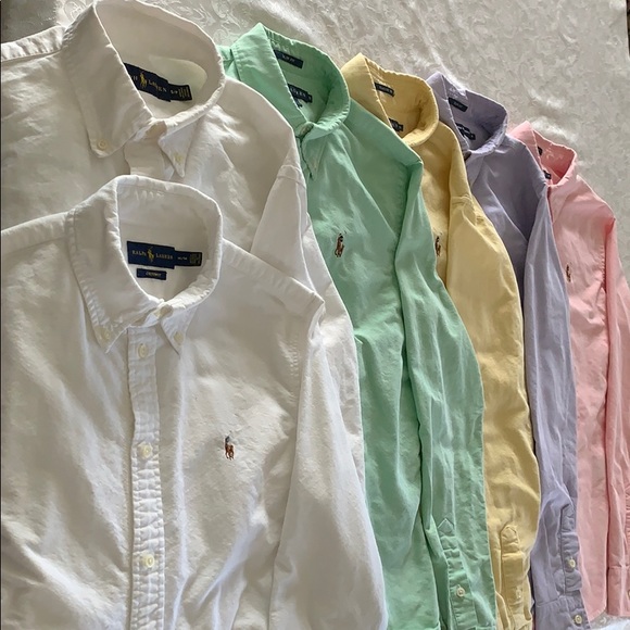 6 used ladies Ralph Lauren oxford shirts. School uniform acceptable. Great for high score or middle school age girl! 2 white (S and M), 1 Green (slim fit sz8), Yellow(classic fit sz6), purplish blue (slim fit sz8), Pink (slim fit sz6). My daughter wore all of these at the same time despite the slightly different sizes. Minimal difference between them. Will entertain selling individually.