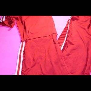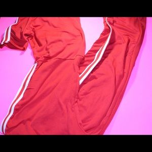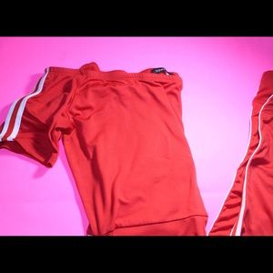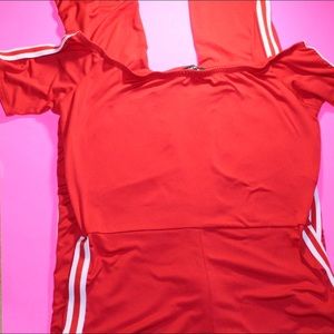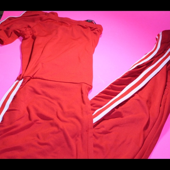 Red jumpsuit/catsuit white strip down the sides Off shoulder Skinny around the ankle 95% Polyester 5% spandex Worn once