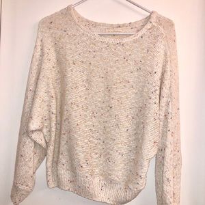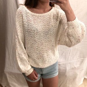 - pastel red, blue, and yellow speckles on a cream white sweater
