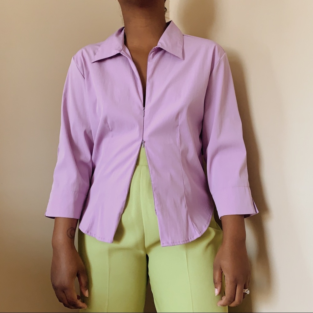 Vintage lilac Y2K double zipper blouse. Features double zipper and three quarter length sleeves.