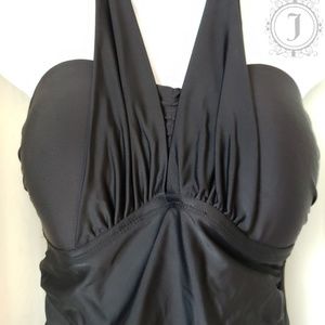 Good used condition, some pilling on bust, pictured. Halter tied, ruched sides. Shell is 82% Nylon 18% Spandex. Lining is 100% Polyester.